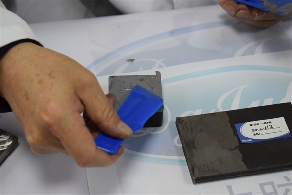 04—【強度測試】把鋁合金屬件放置在173度的烘烤箱內(nèi)幾個小時,然后取出,接下來用其他的厚板金屬對此鋁合金進行敲打測試,結(jié)果并沒有脫膠,也沒有發(fā)生斷裂。