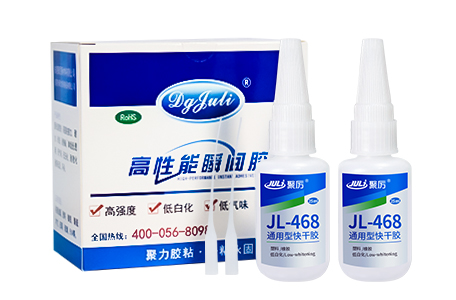 聚厲牌JL-468塑料專用瞬間膠主要成份氰基丙稀酸酯, 符合環保標準,已通過歐盟ROHS標準和SGS檢測, 針對PP、PVC、ABS、硅膠、橡膠、PC、PS、AS、PPS、EVA、PET、皮革等柔韌性材質通用粘合研發生產的單組分瞬間粘接劑;單組分,施工便利,非常適合連續化生產線作業;